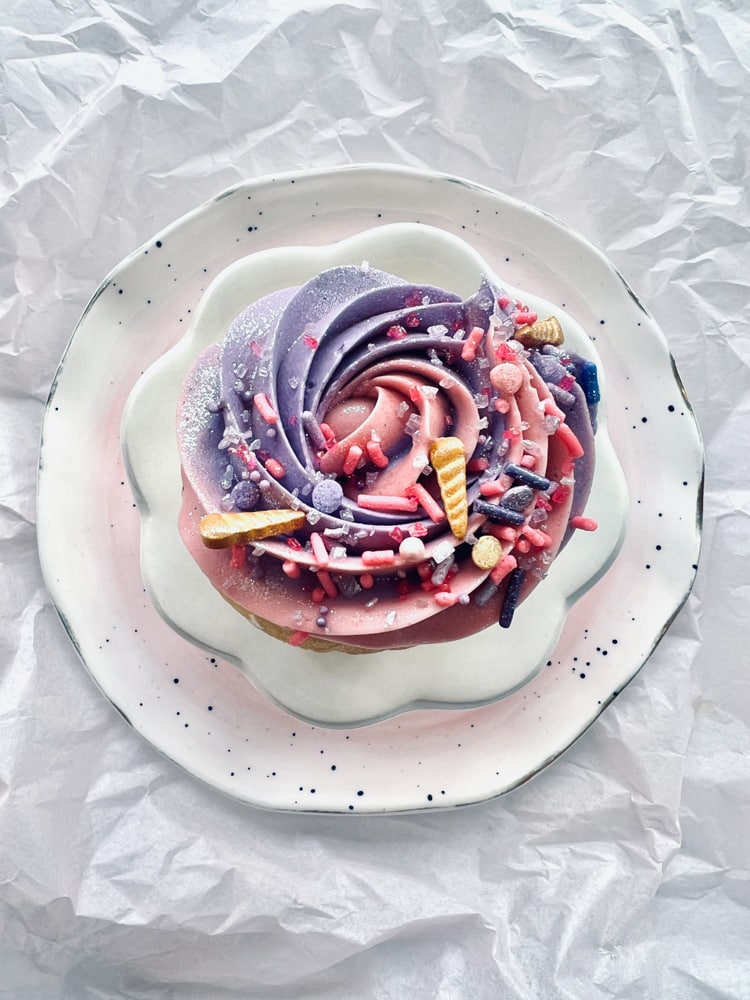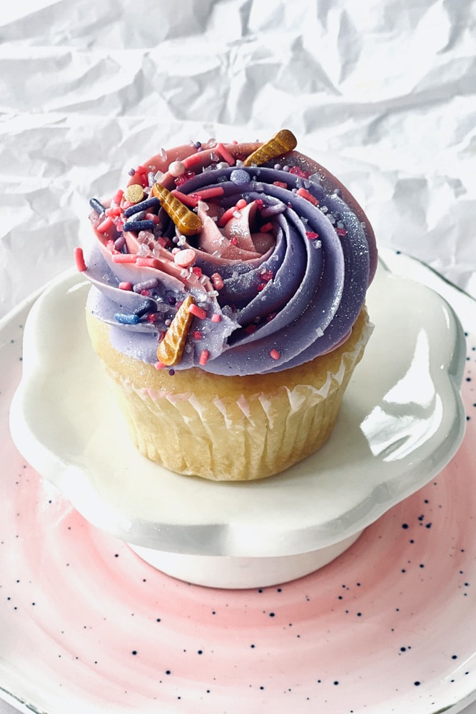 Cupcakes will be decorated with a tinted swirl of pink and purple vanilla Swiss meringue buttercream and finished with coordinating sprinkles + edible shimmer! Exact colors/sprinkles may vary slightly from photo.