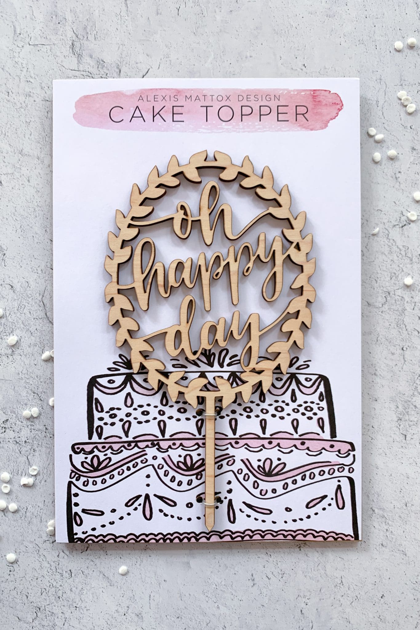Reusable, food safe cake topper is made from a high quality maple wood. 7″ tall total height including base.