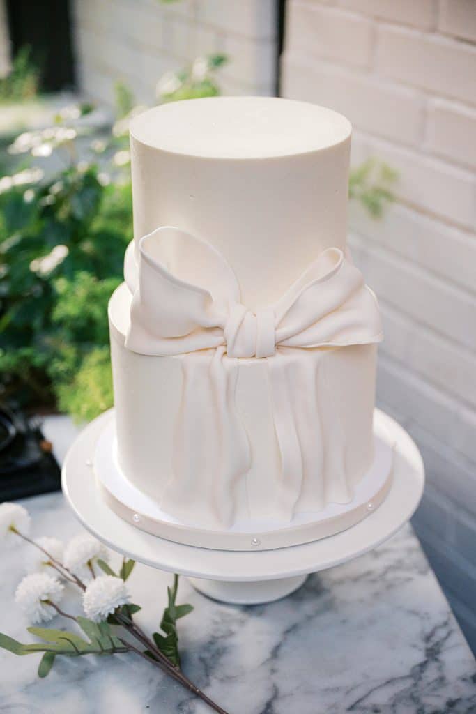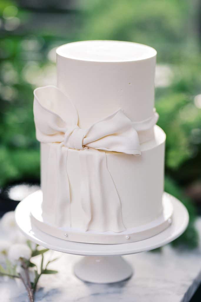Crisp edges and perfectly smooth buttercream make a beautiful backdrop for the draped fondant bow that adorns this cake. Named after a chic bride who recently ordered this for her Philadelphia wedding.