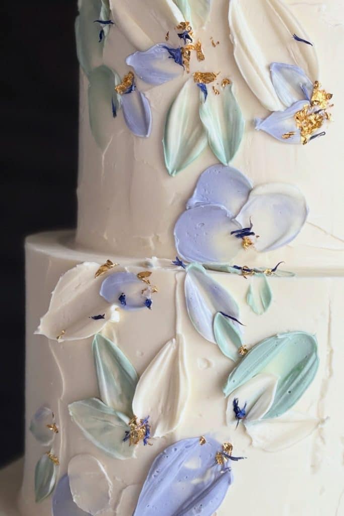 Lovely buttercream petals cascade down the front of this pretty, textural buttercream cake. We can fully customize the colors of this cake to coordinate with your wedding palette!