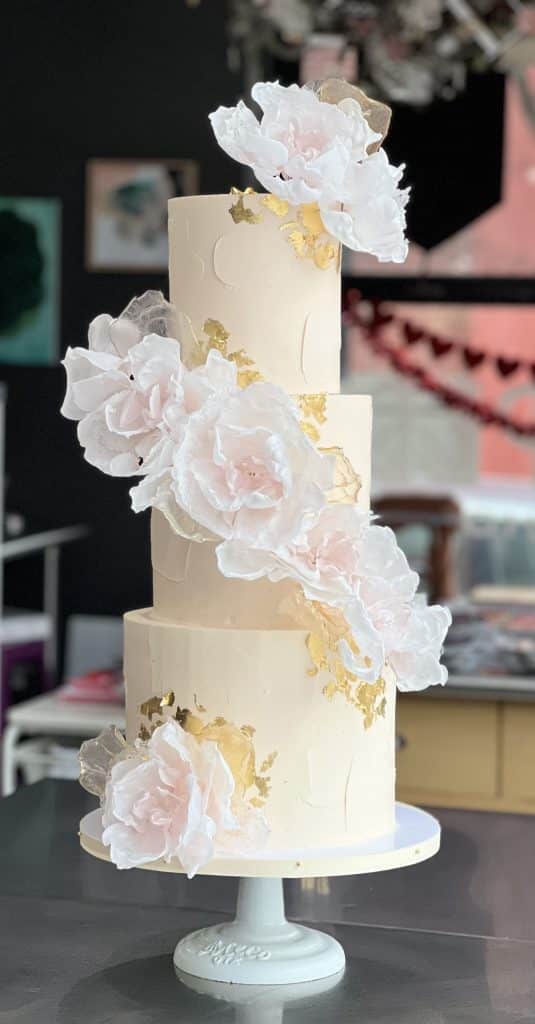 Delicate statement flowers and barely-pink lace adorn this romantic cake.