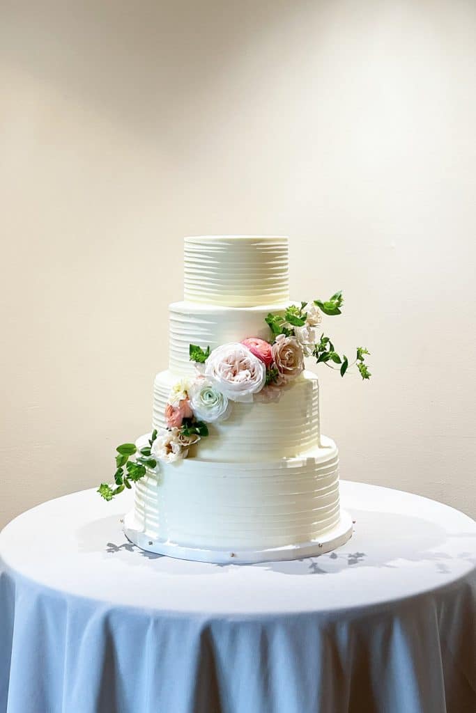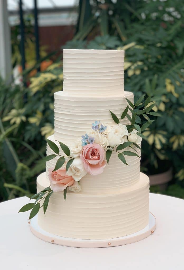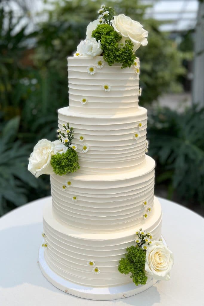 Our classic banded buttercream wedding cake is perfect with fresh greenery and florals.