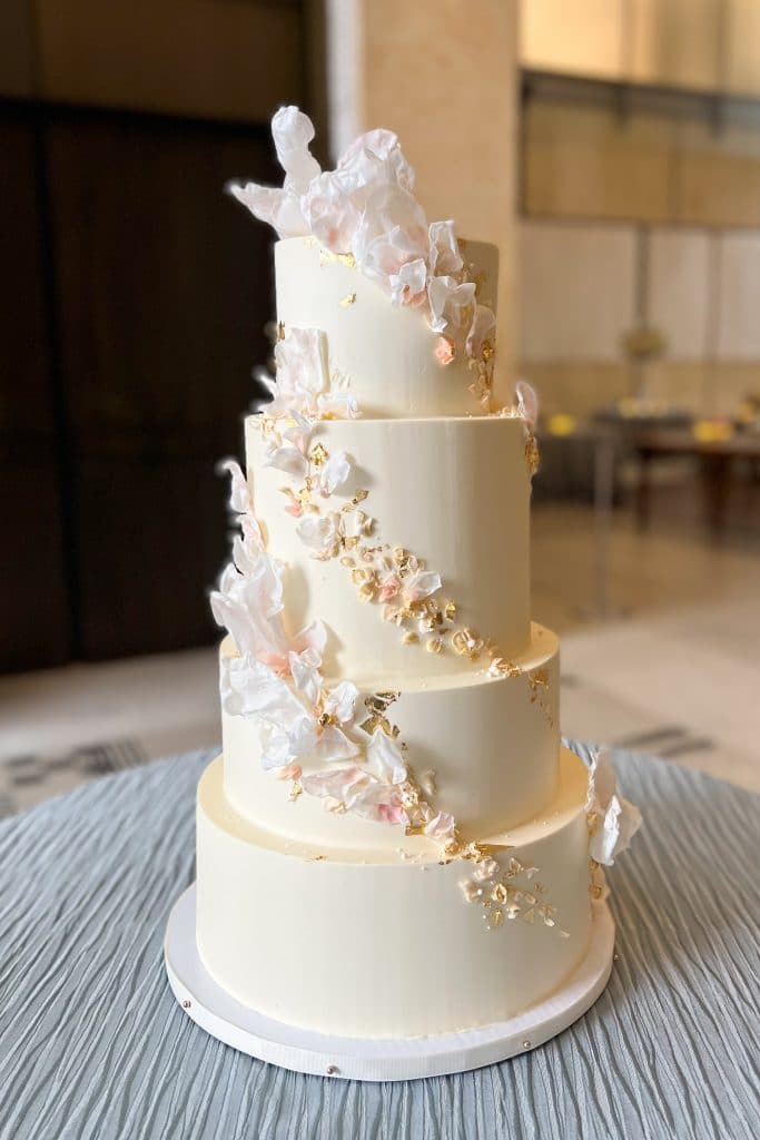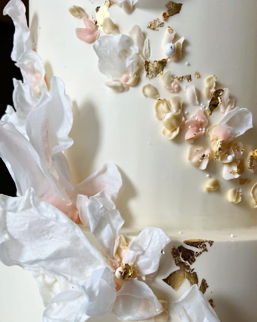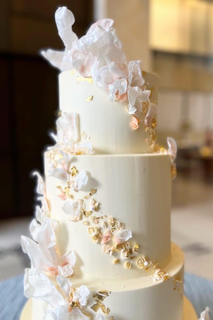 Romantic blooms in buttercream and wafer paper twirl around cake tiers to create movement. This romantic cake be created in endless color combinations. Optional gold or silver leaf adds a lovely final touch.