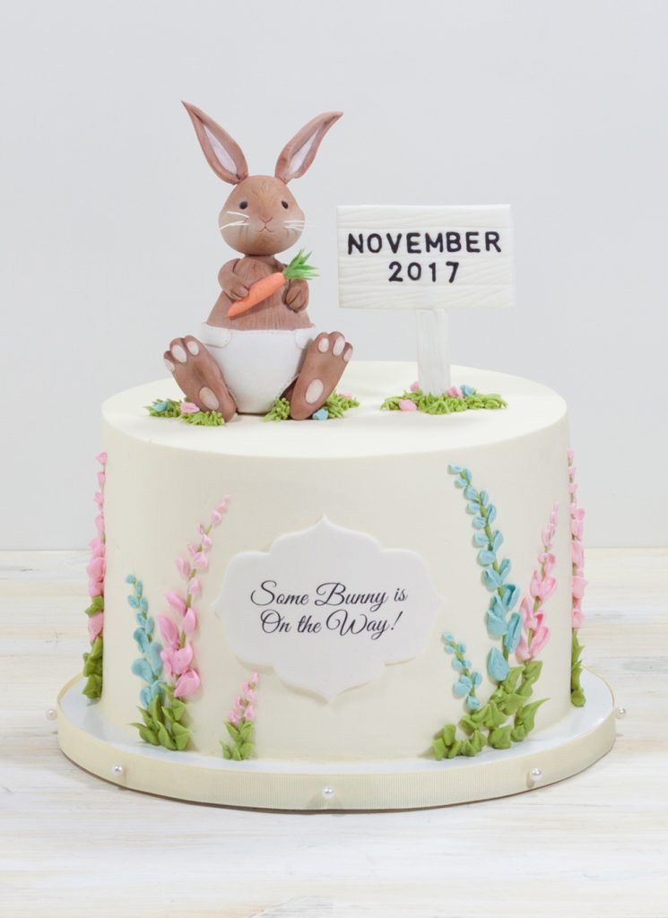 The prettiest floral edging and a reading bun make this a super-cute shower cake!