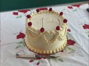 Brett and Catie ordered our 8″ Vintage Frill Cake, which can serve 15-20 guests. They chose vanilla buttermilk cake with our signature vanilla buttercream icing, and opted to add decorative cherries and a tart lemon curd pop of flavor.
