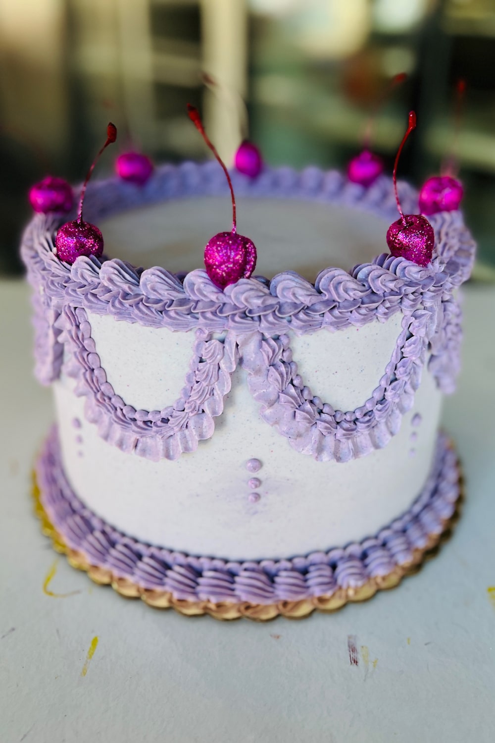 Our Vintage Frill cake is available in multiple sizes to serve small gatherings or even larger parties such as a small wedding. 6″ serves 10-12, 8″ serves 15-20, 4/6 micro tiered cake serves 15-18, 6/8 tiered cake serves 30-40. If you need a larger size, please text 215-598-5449!
