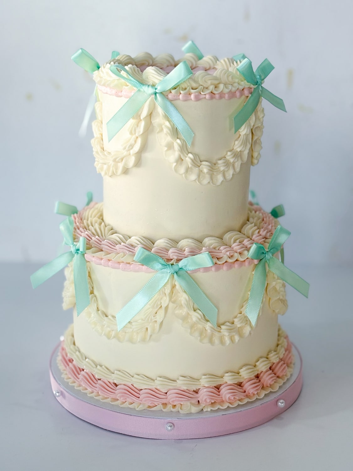 Add vintage charm to your special occasion with our Vintage Bow cake. Featuring delicate buttercream frills and elegant piping, this cake is perfect for birthdays, bridal showers, baby showers, and weddings. Choose from our delicious cake flavors and customize the colors to match your event.