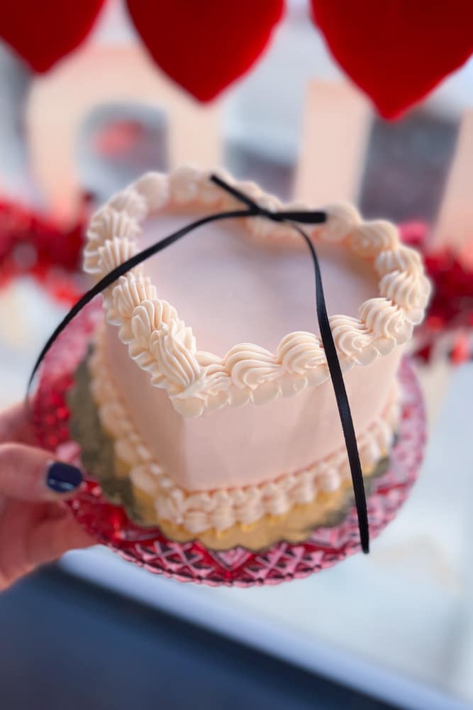 Our Mini Vintage Heart Cake is made with pink prosecco cake filled with raspberry preserves and raspberry meringue buttercream. These sweet little layer cakes are finished with blush pink or burgundy meringue buttercream, vintage piping and a black bow. Makes the perfect mini birthday or couple’s cake. Order is for one cake. Pre-order today for pick up February 13 or 14.