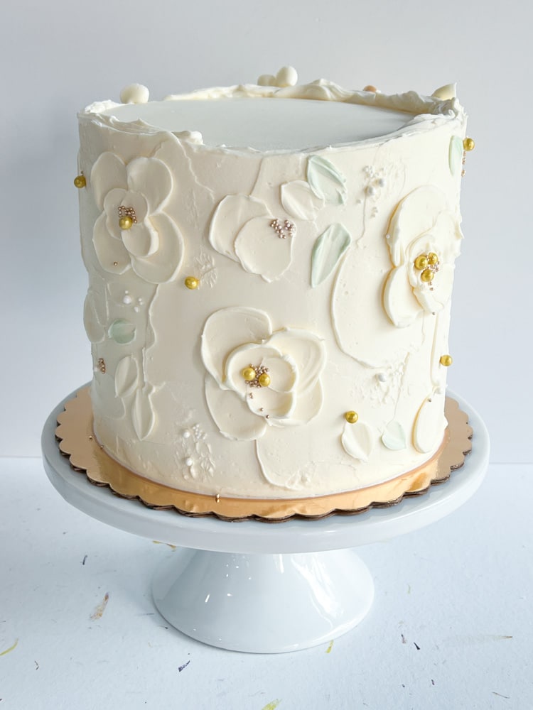 Our Palette Garden cake is a stunning, hand-painted floral design crafted with buttercream. Perfect for birthdays, baby showers, weddings, and more. This cake is a beautiful, artistic centerpiece that tastes as amazing as it looks. We highly recommend adding the optional metallic leaf to this design.