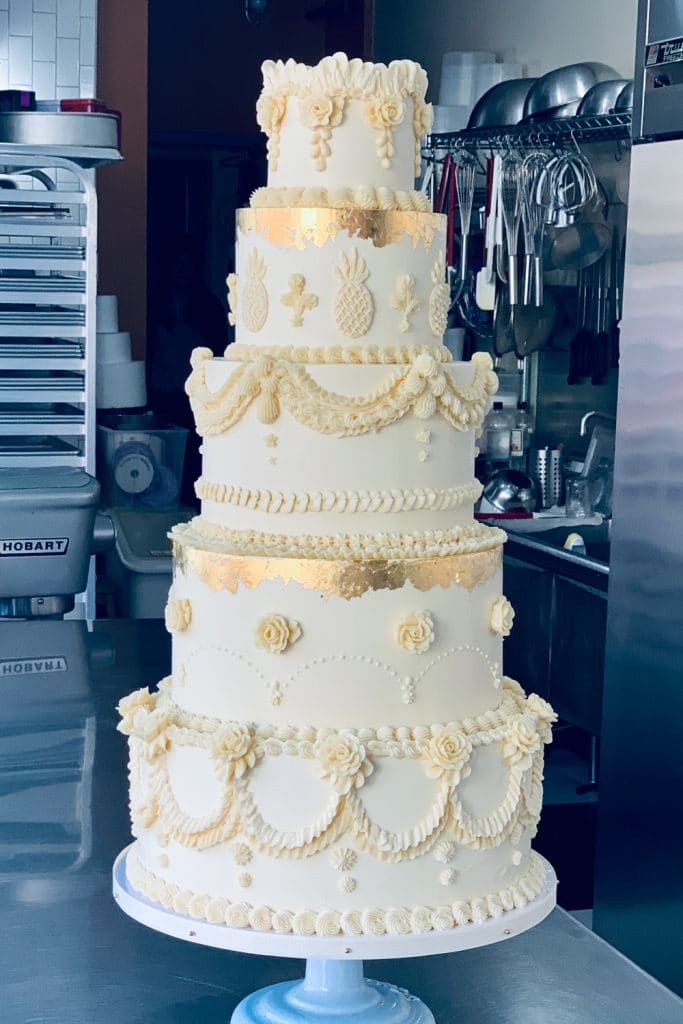 Vintage-style piping in 100% Swiss meringue buttercream covers this glamorous, statement cake.