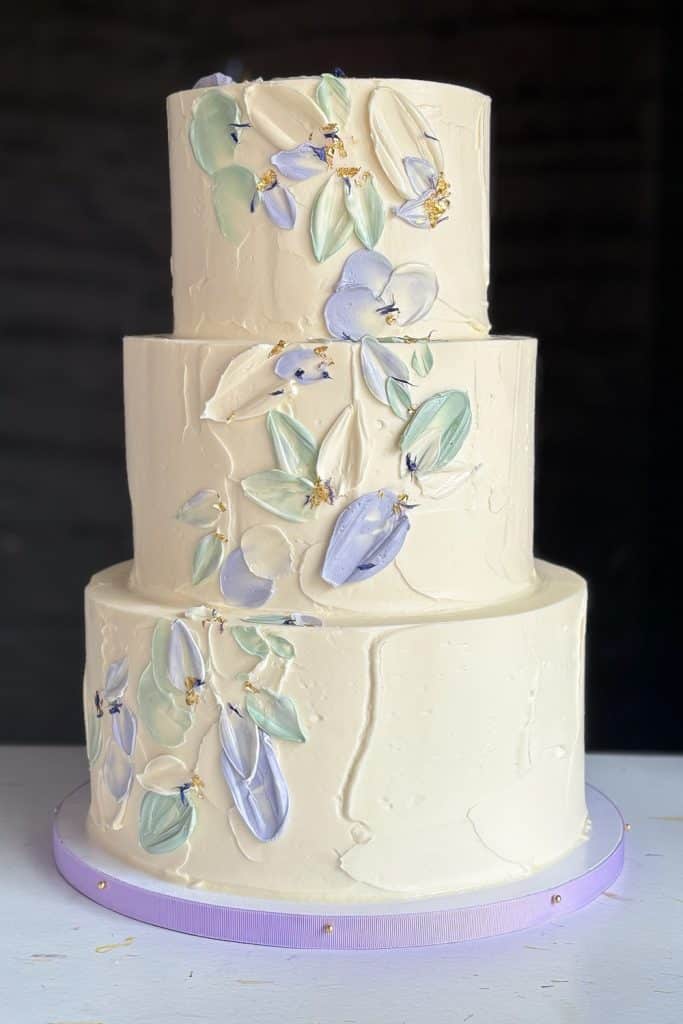 Lovely buttercream petals cascade down the front of this pretty, textural buttercream cake. We can fully customize the colors of this cake to coordinate with your wedding palette!