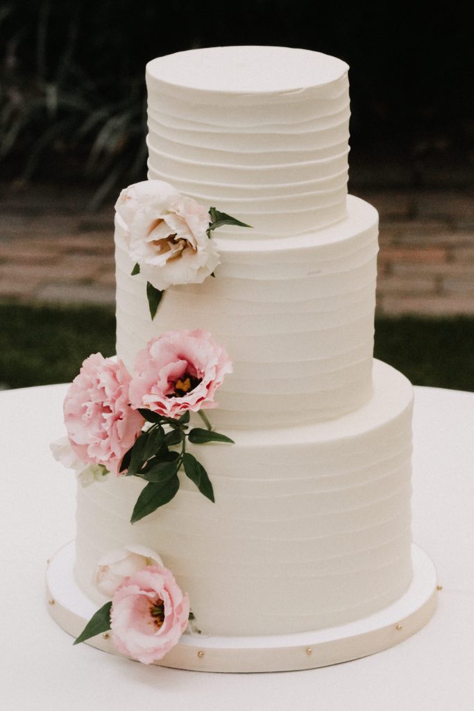 Our classic banded buttercream wedding cake is perfect with fresh greenery and florals.