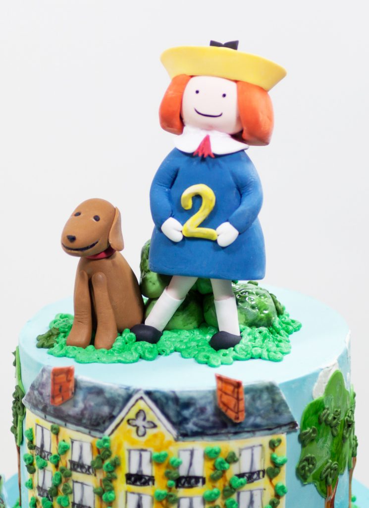 This cake design was inspired by the beloved series of Madeline books by Ludwig Bemelmans. A sculpted Madeline and her dog sit on top of the cake, and hand-painted scenery of her home in Paris completes the look.