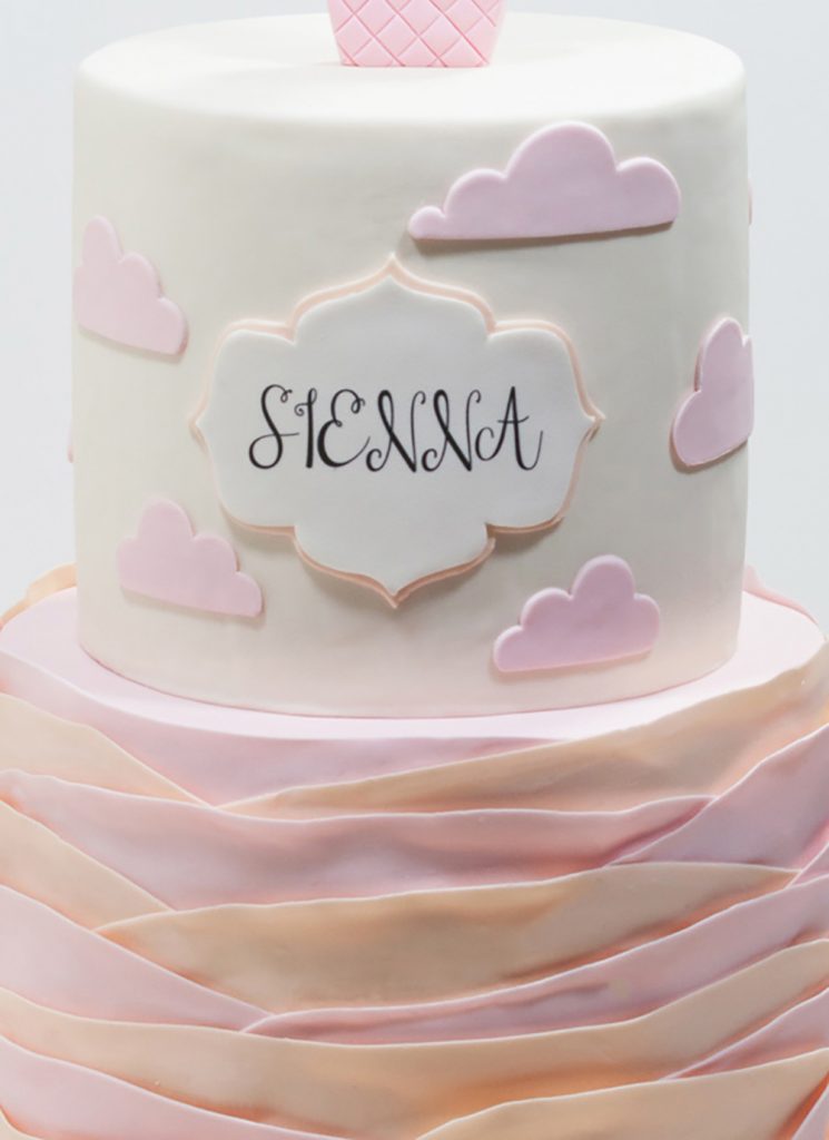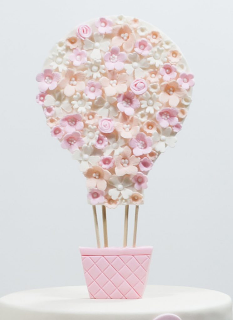 A hot air balloon covered in mini pink and peach flowers floating in a sky of pink clouds makes one cute cake! Matching ruffles cover the extra tall base tier.