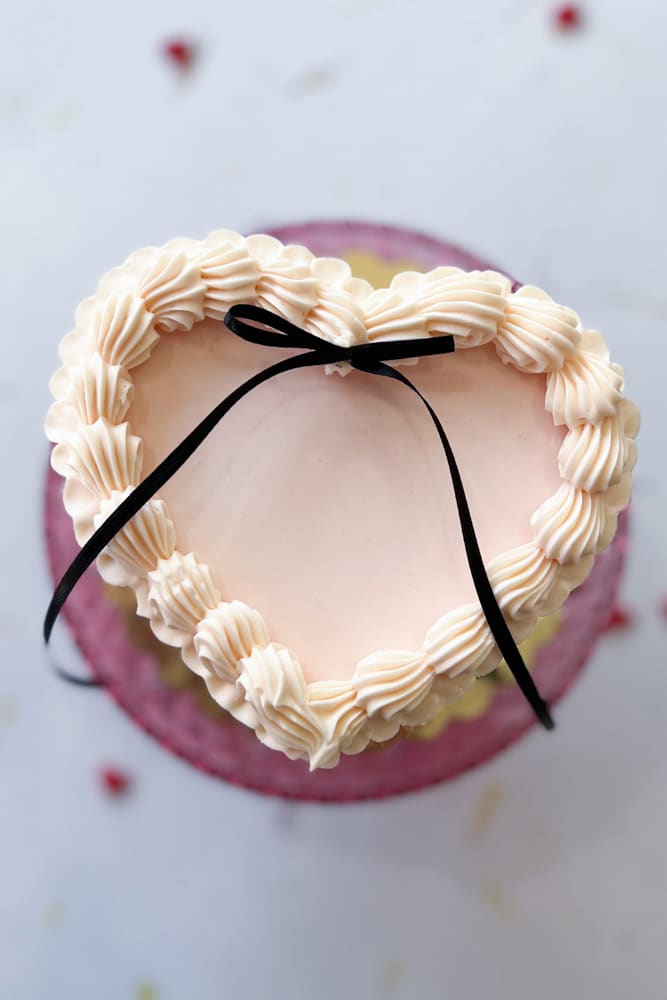 Our Mini Vintage Heart Cake is made with pink prosecco cake filled with raspberry preserves and raspberry meringue buttercream. These sweet little layer cakes are finished with blush pink or burgundy meringue buttercream, vintage piping and a black bow. Makes the perfect mini birthday or couple’s cake. Order is for one cake. Pre-order today for pick up February 13 or 14.