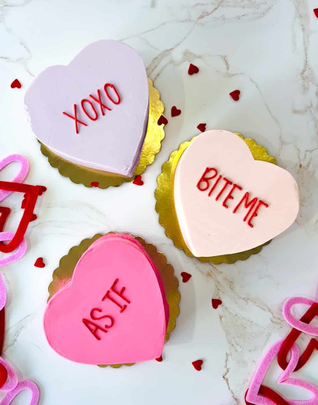 Our Mini Conversation Heart Cake is made with chocolate midnight cake layered with gooey salted caramel and chocolate meringue buttercream. Finished with a brief message (or name) of your choice hand-piped in red. Makes the perfect couple’s cake. Order is for one cake. Pre-order today for pick up February 13 or 14.