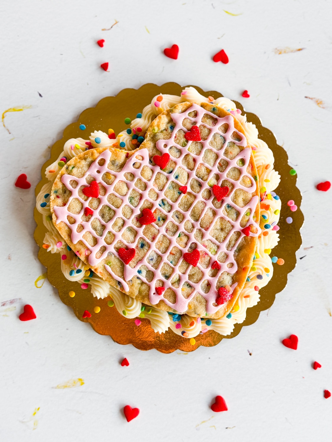 We created a brand new cookie cake this Valentine’s Day! This special heart-shaped funfetti sugar cookie is finished with sprinkles, glitter and a cute buttercream border. We made this cookie cake the perfect sharing size for couples. This one is a surefire gift idea. Available Feb 4-28.