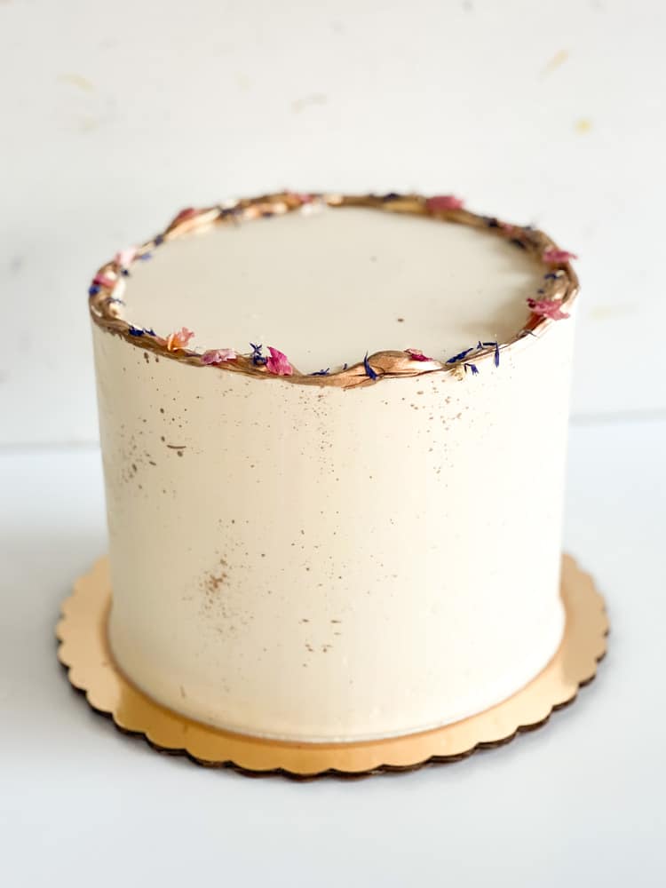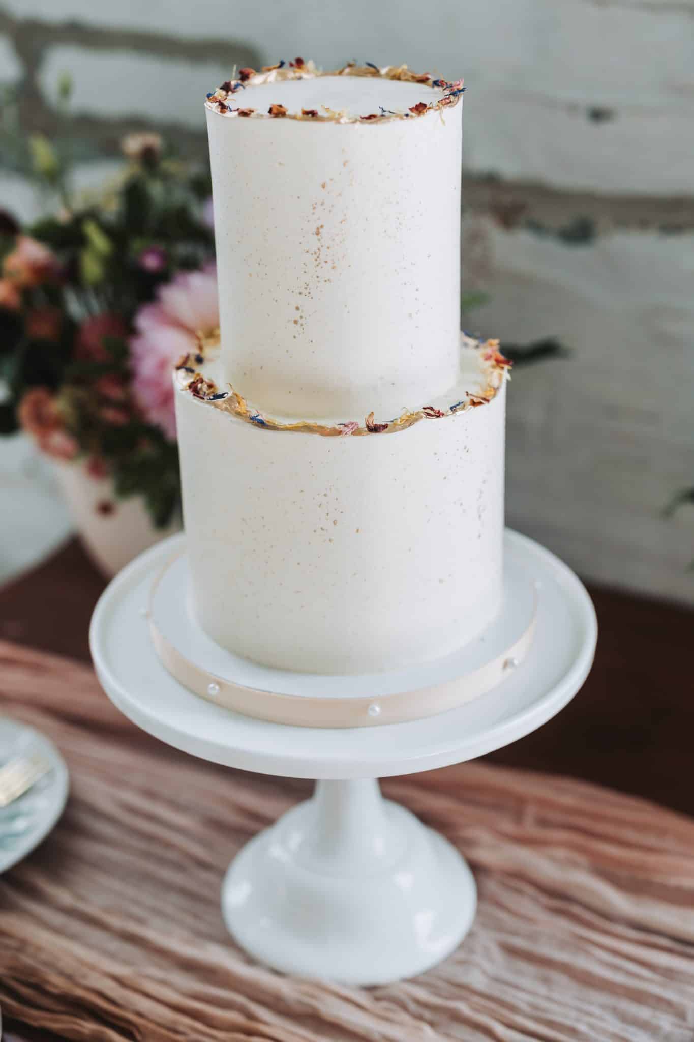 This classic cake is perfect for celebrating everything from micro-weddings to birthdays! The outside of the cake is artfully iced with smooth vanilla meringue buttercream and finished with a metallic deckled edge and dried floral sprinkles. Main photo is a 4/6″ size.