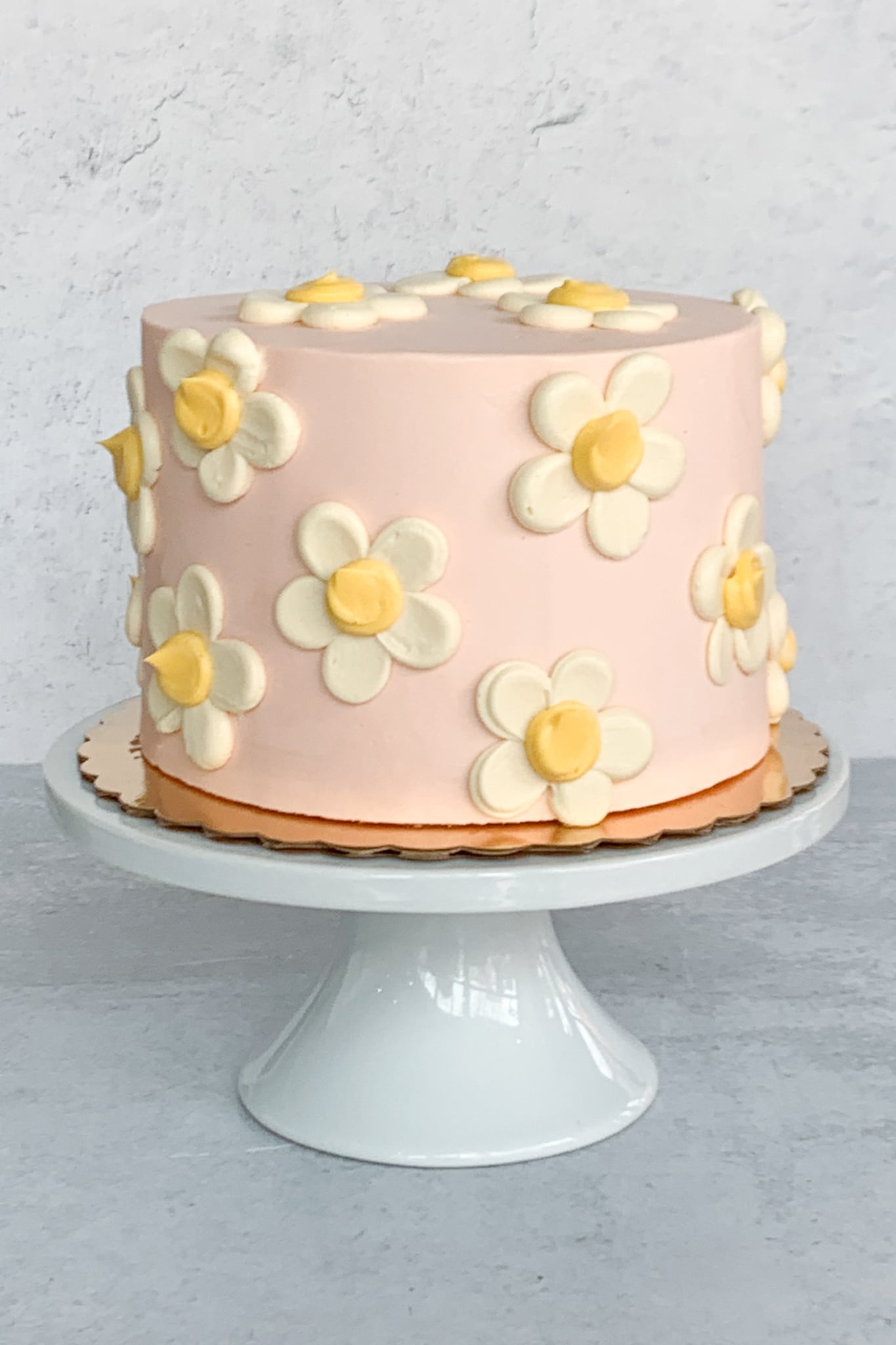 The outside of the cake is artfully iced with hand-piped vanilla meringue daisies in the background color of your choice. Daisies will remain white with yellow centers.