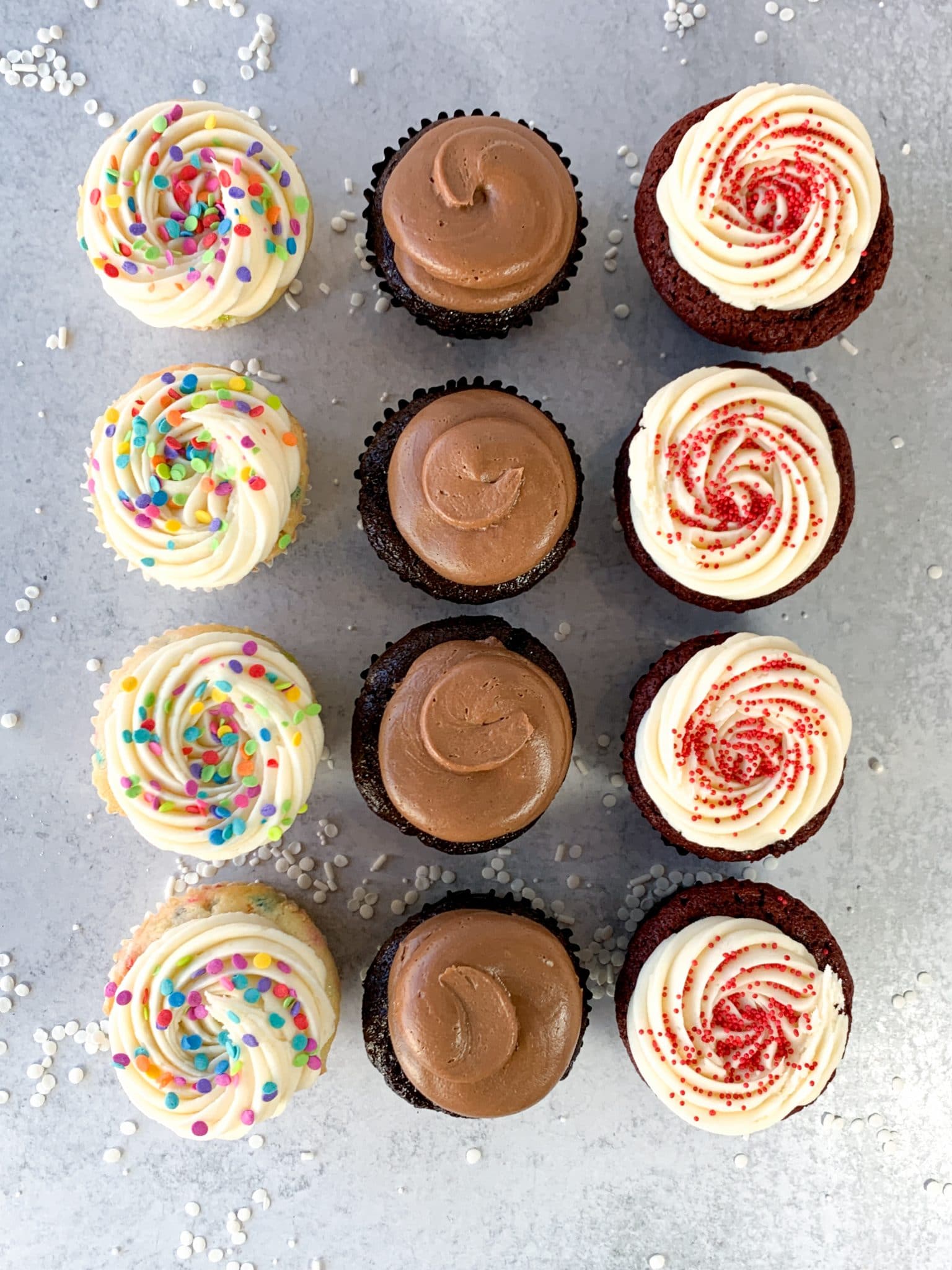 Send an assortment of our delicious cupcakes to someone you love! Perfect for birthdays, thank you gifts, or just to show you care. This assortment includes a mix of our fan-favorite funfetti, red velvet, and double chocolate midnight cupcakes.